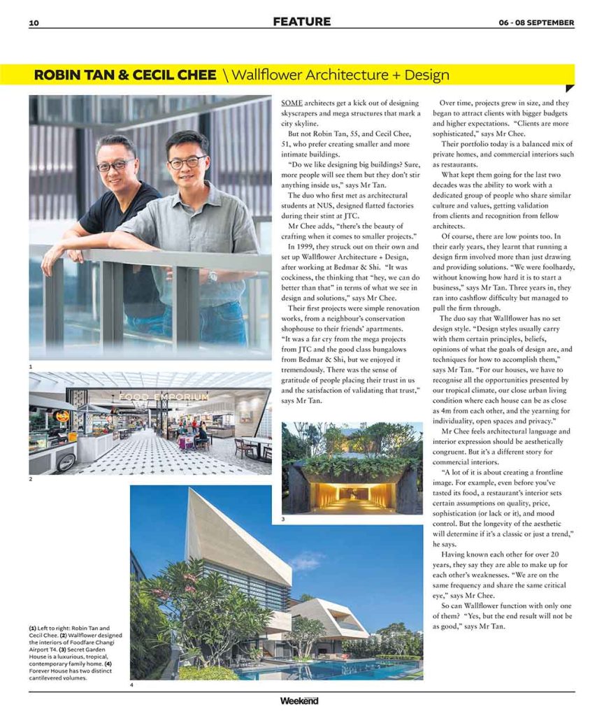 Wallflower was founded by Tan Chai Chong Robin and Cecil Chee, bringing together a combined experience of commercial projects and residential developments. Established in 1999, Wallflower Pte Ltd & Wallflower Architecture + Design have undertaken a wide spectrum of work, ranging from commercial and residential projects and have received numerous awards for excellence in design, having been also widely featured in local and international publications. Wallflower was quickly recognised by Singapore’s Ministry of Information, Communication and the Arts, as one of Singapore’s key industry players in design.
