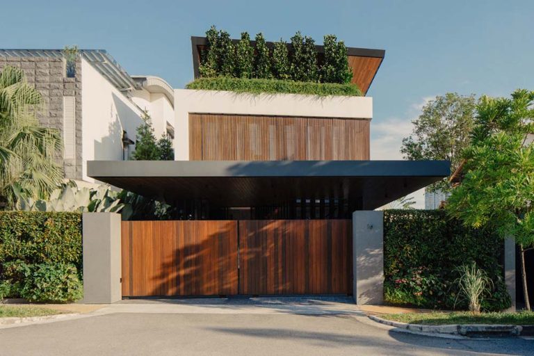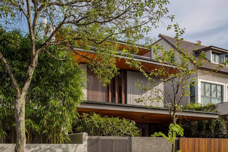 Family gatherings are a daily occurrence, and large celebratory functions also feature regularly for the client. The first storey is designed to be visually expansive and uncluttered, and encourages the intermingling of space, whether one moves through the garden, living or dining. The perceived spatial boundary is not architecturally delineated in a traditional sense, but by a soldier-line of narrow polyalthia trees along the boundaries of the site. However, architecturally, the trees provide a level of purpose no man-made wall is able to. It shields the house from neighbouring windows but its narrow footprint still allows sun to reach the grass, while freeing up space on the lawn for play and parties. What may not seem so obvious though is that the tines of polyalthias are literally evaporative fingers, combing the air of some of its heat each time the wind blows. The swimming pool is placed centrally between garden and living both as a focal centre and also as a central evaporative cooling surface.